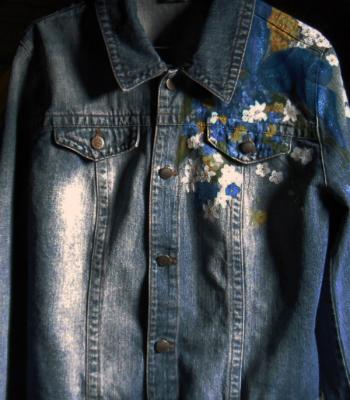 personalizzare un semplice giubbotto di jeans ho dipinto sulla spalla sinistra un mazzolino di fiori scelti dalla mia cliente legati con un fiocco blu in glitter.
